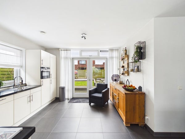 Vanuit de keuken is er toegang tot de tuin, de bijkeuken, de berging en de salon. In de bijkeuken bevindt zich de wasmachineaansluiting en is er ruimte voor een extra koelkast of vriezer.