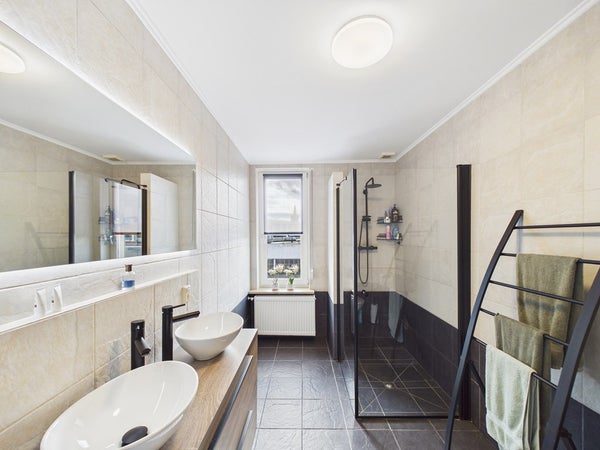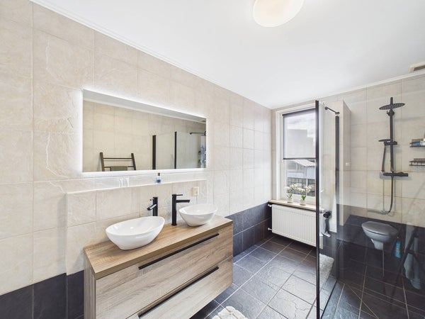 Vanaf de overloop met vaste trap naar de tweede verdieping is er toegang naar de twee slaapkamers en de badkamer. De badkamer is volledig betegeld en uitgerust met een douche, een stijlvol wastafelmeubel met dubbele wastafel en een hangtoilet. De gehele eerste verdieping is afgewerkt met een nette laminaatvloer.