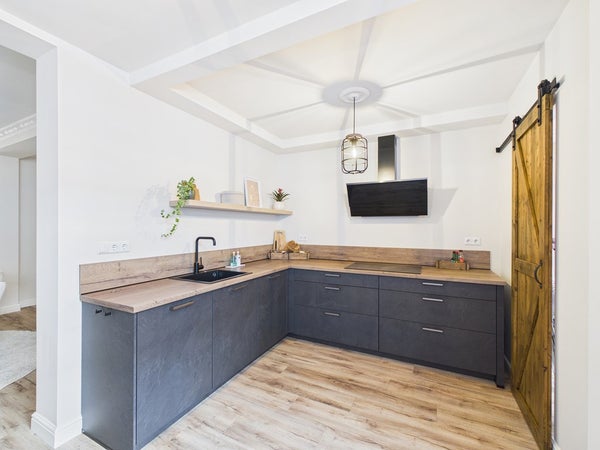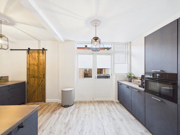 Binnenkomst in de hal met karakteristieke tegelvloer. Vanuit de hal is er toegang naar het toilet en de woonkamer. De woonkamer is dankzij de royale uitbouw met openslaande deuren een heerlijke leefruimte. Je wordt direct verrast door de sfeervolle uitstraling en smaakvolle accenten die perfect aansluiten bij het karakter van de woning. Er is een halfopen keuken aanwezig. De luxe keuken is een ware eyecatcher en voorzien van alle benodigde inbouwapparatuur. Daarnaast is er een gezellige koffiehoek gecreëerd. Middels een schuifdeur is er toegang naar de bijkeuken. Deze is ingericht als wasruimte. Tevens is er voldoende plaats voor extra kastruimte. De woonkamer, keuken en bijkeuken zijn afgewerkt met een mooie neutrale PVC vloer.