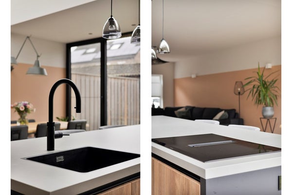 o Kookeiland met inductiekookplaat met afzuiging en wasbak met Quooker