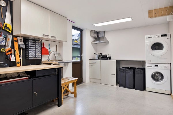 • Garage (8,7 m²) met openslaande deuren en grote inbouwkast en toegang tot de bijkeuken