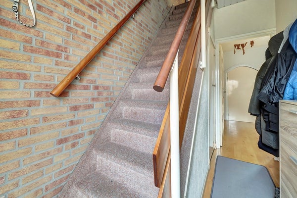 Bij binnenkomst sta je in de hal met garderobe. Hier vind je de trapopgang naar de eerste verdieping en toegang tot de trap-/kelderkast – ideaal voor extra opbergruimte. Vanuit de hal stap je via een deur de woonkamer binnen.