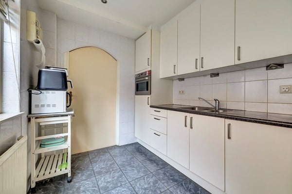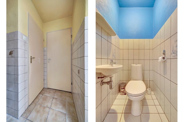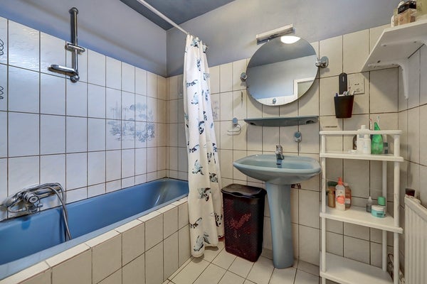 Vanuit de keuken bereik je de bijkeuken, waar de aansluitingen voor de wasmachine zijn geplaatst. Vanuit deze bijkeuken heb je toegang tot het toilet en de badkamer. De badkamer is voorzien van een ligbad met douche, een wastafel en een radiator.