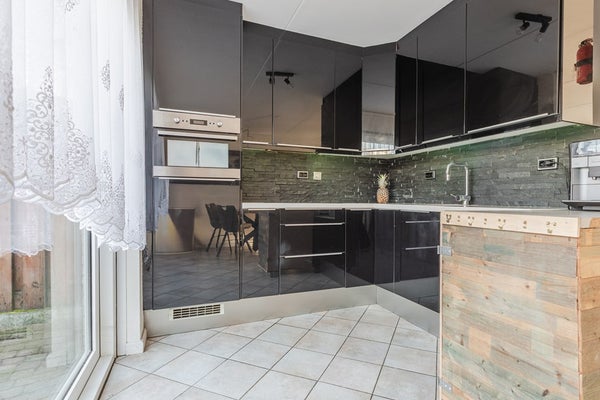 Aan de achterzijde bevindt zich de open keuken, die in direct contact staat met de woonkamer. De keuken is praktisch opgesteld en biedt voldoende werk- en kastruimte. Vanuit de woonkamer is er toegang tot de achtertuin, waar rust en privacy samenkomen.