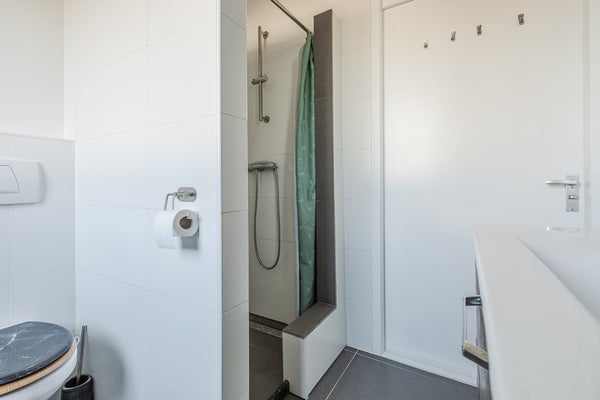 De badkamer is centraal gelegen en voorzien van de benodigde sanitaire voorzieningen. De overloop verbindt alle ruimtes op een logische en efficiënte manier.