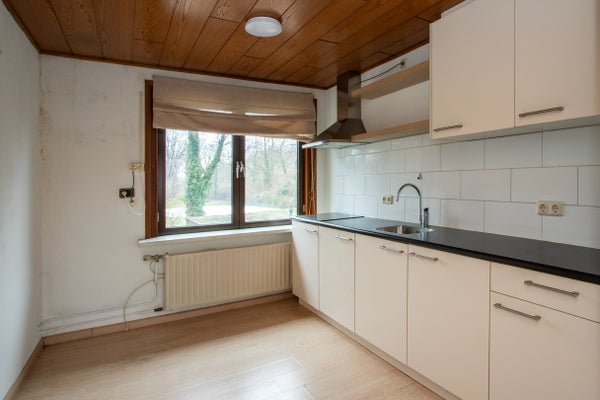 Aansluitend bevindt zich de keuken, recht opgesteld en voorzien van een inductiekookplaat met afzuigkap, koelkast, RVS spoelbak en volop berg- en werkruimte. Dankzij het grote raam is ook hier sprake van veel daglicht en is er voldoende ruimte voor het plaatsen van een eethoek.