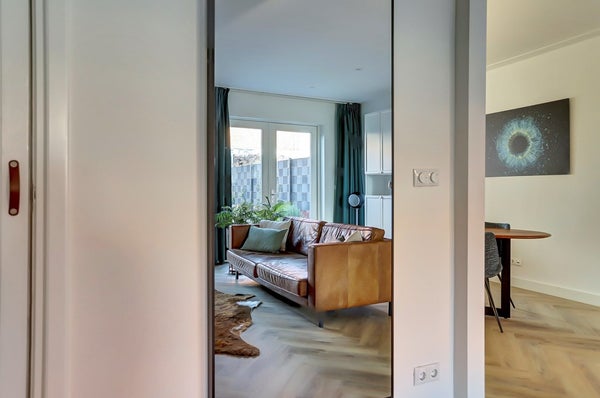 Binnenkomend stap je in de lichte hal met garderobe, waar de originele glas-in-loodramen meteen sfeer creëren. Vanuit hier heb je toegang tot het moderne toilet en loop je via een deur zo de sfeervolle woonkamer binnen.