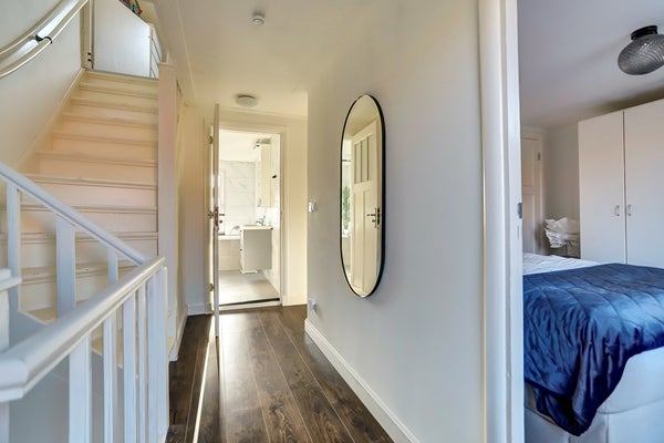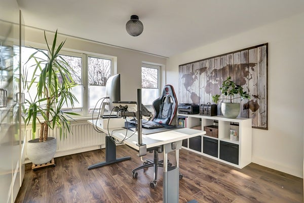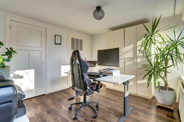 Op de overloop is bovendien een afgesloten bergkast aanwezig, waar de wasmachine en droger netjes zijn weggewerkt.