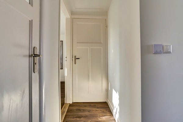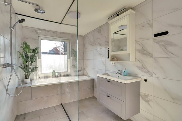 Aan de voorzijde van de woning ligt de eerste ruime slaapkamer, voorzien van een handige inbouwkast. Daarnaast bevindt zich ook aan de voorzijde de volledig vernieuwde badkamer, uitgerust met een ligbad, inloopdouche, hangend toilet, wastafelmeubel en designradiator. Zowel de wanden als de vloeren zijn stijlvol doorgetegeld.
