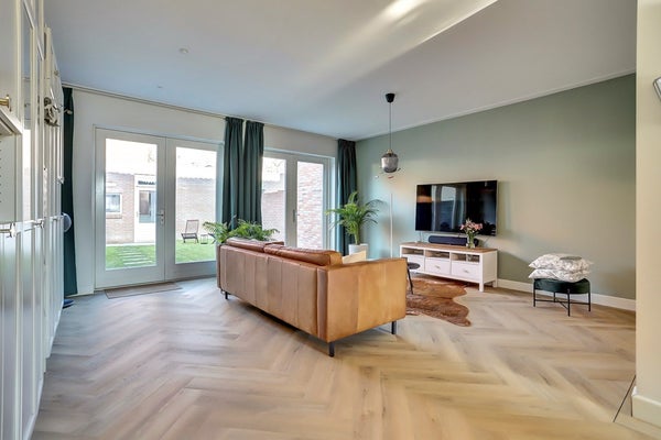 De royale, lichte zithoek met een tweetal openslaande deuren naar de tuin vormt de ideale plek voor gezellig samenzijn. Dankzij de brede raampartij stroomt het daglicht rijkelijk binnen. Vanuit deze ruimte heb je tevens toegang tot de trap-/kelderkast – perfect voor extra opbergruimte.