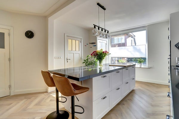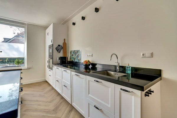 De lichte en ruime woonkamer met open keuken is een heerlijke plek om thuis te komen. Aan de voorzijde bevindt zich de moderne keuken met een stijlvol keukeneiland, dat volop werk- en opbergruimte biedt voor de enthousiaste thuiskok. De keuken is uitgerust met diverse inbouwapparaten, waaronder een vaatwasser, inductiekookplaat met geïntegreerde afzuiging, oven, magnetron en een koelkast met vriezer.