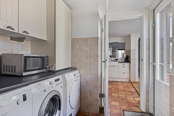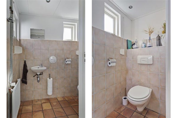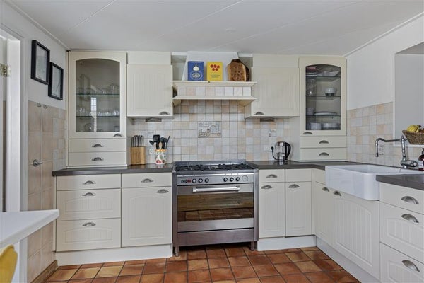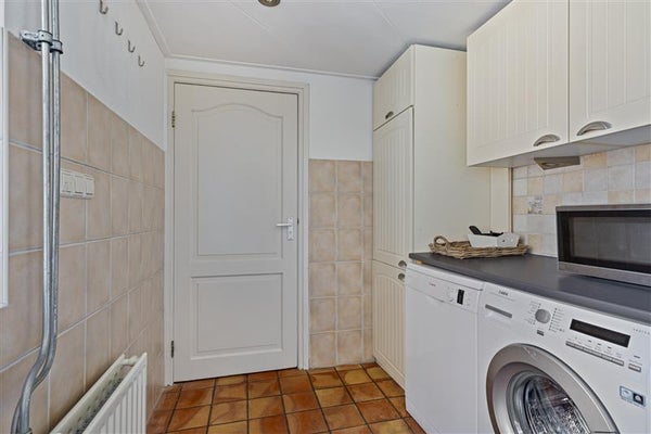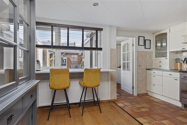 De uitbouw aan de achterzijde van de woning heeft de keuken verrijkt met een landelijke stijl en praktische indeling. Met een mooie boeren tegelvloer, een doorkijkje en een lichtkoepel die natuurlijk licht laat binnenstromen, is koken hier een waar plezier. Het moderne 5-pits gaskookplaat en de grote oven maken het bereiden van de meest heerlijke maaltijden een genot. De bijkeuken biedt extra opbergruimte, perfect voor je wasmachine en droger, en hier vind je ook de toiletruimte met een fonteintje.