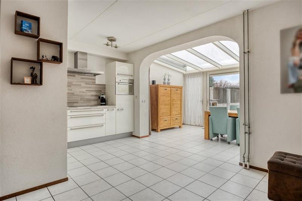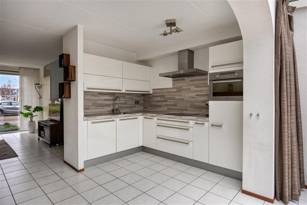 Aan de achterzijde van de woning bevindt zich de moderne keuken. De modernee hoekopstelling is van alle gemakken voorzien: een ingebouwde oven, een energiezuinige vaatwasser en een royale koelkast zijn slechts enkele van de aanwezige faciliteiten. Kookliefhebbers kunnen hier hun hart ophalen dankzij de strakke afwerking en praktische indeling.