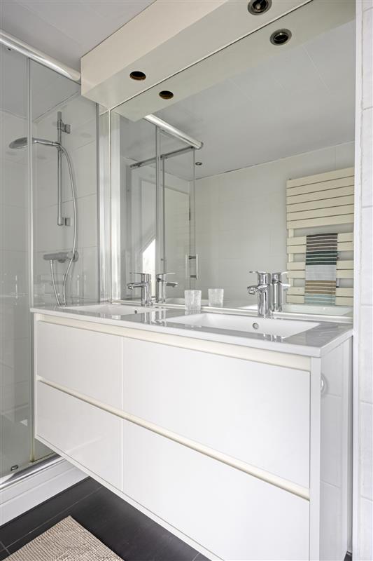 Luxe badkamer met ligbad, douchecabine en dubbele wastafel.