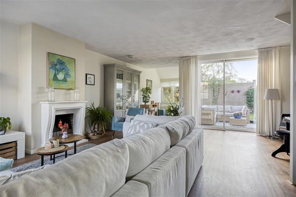 Ruime woonkamer vol licht en sfeer: De houten vloer, open haard en schuifpui maken het dé plek om samen te komen.