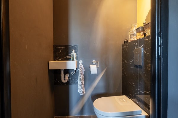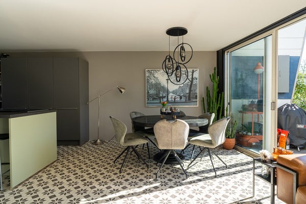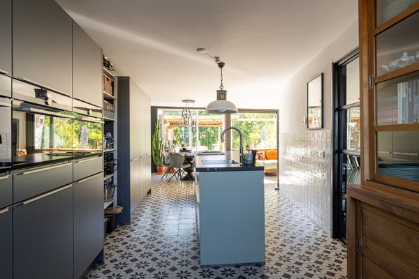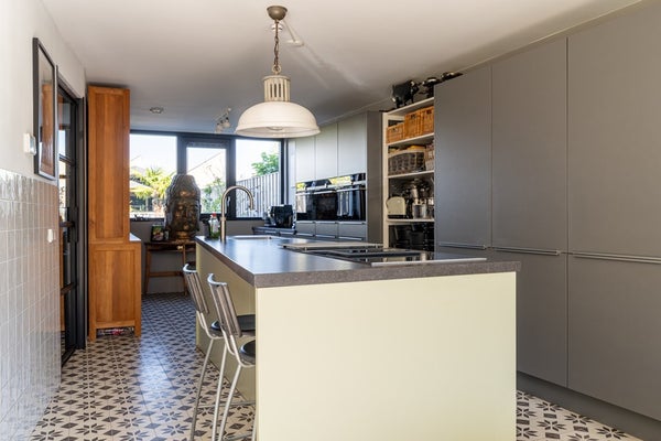 De begane grond is afgewerkt met een moderne tegelvloer met comfortabele vloerverwarming. Via de hal met toilet, meterkast en verlichte trapopgang bereikt u de leefruimte met open keuken. De luxe keuken is voorzien van hoogwaardige inbouwapparatuur, waaronder een inductiekookplaat met geïntegreerd afzuigsysteem, Quooker, magnetron, oven, stoomoven, vaatwasser en maar liefst twee koel-vriescombinaties. Via de schuifpui heeft u direct toegang tot de fraai aangelegde achtertuin met kunstgras en een stijlvolle overkapping.