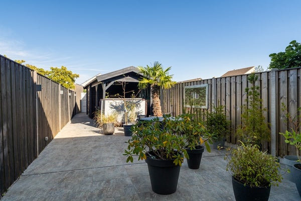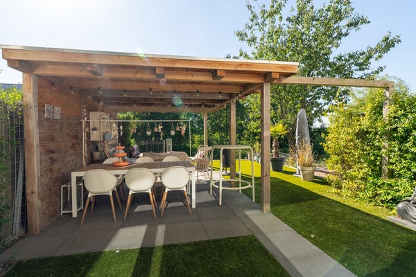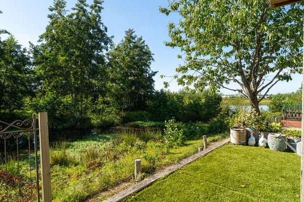 De voortuin is voorzien van een houten overkapping met schuur en een wateraansluiting met schrobputje. De achtertuin is gunstig gelegen op het westen en beschikt over een houten overkapping, wateraansluiting en onderhoudsvriendelijk kunstgras. Privacy, rust en het unieke uitzicht maken dit een heerlijke plek om te ontspannen.