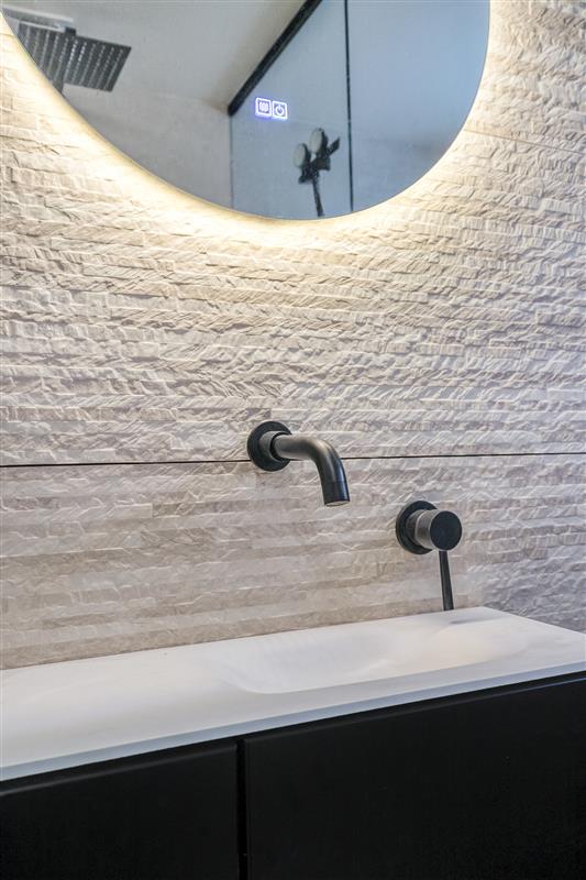 Vernieuwde badkamer: Voorzien van een strakke inloopdouche, modern wastafelmeubel en toilet.