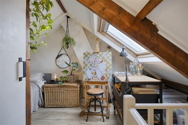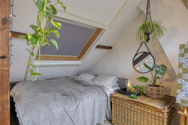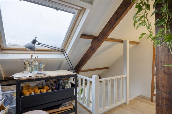 De trap in de hal brengt ons naar de royale bovenverdieping. Hier wacht een verrassend open en loftachtige ruimte met een dakkapel, die zorgt voor een overvloed aan daglicht. Met een extra keukenblokje én een privébadkamer kun je hier alle kanten op. Creëer een prachtige slaapkamer met een eigen loungehoek, richt het in als studio of gebruik het als inspiratieplek voor creatieve projecten. Wat je ook kiest, deze ruimte ademt mogelijkheden.