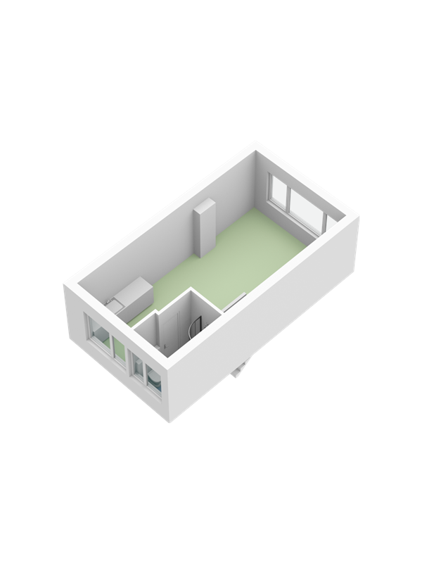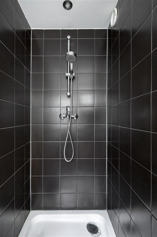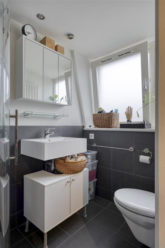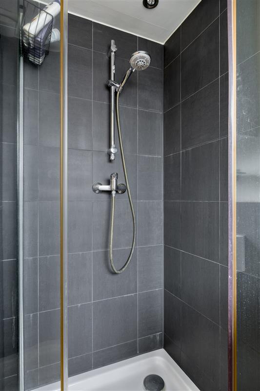 De badkamer, uitgevoerd in een lichte kleurstelling met donkere tegels, beschikt over een toilet, wastafel en douche. Een vaste trap leidt naar een extra slaapetage met vide met extra bergruimte, waar je al jouw persoonlijke bezittingen een plek kunt geven.