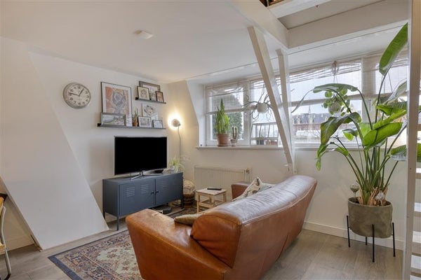 Sfeervolle woonkamer met veel lichtinval en een mooie houten vloer.