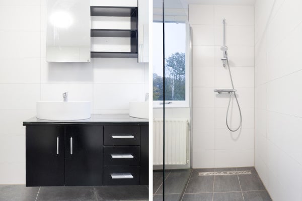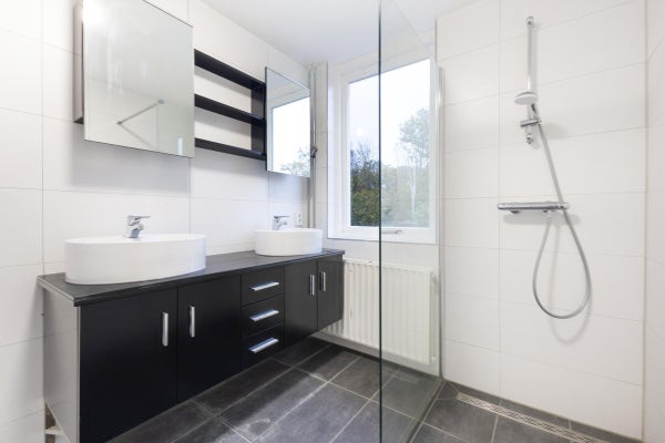 Op de eerste verdieping vind je drie ruime slaapkamers en een moderne badkamer met dubbele wastafel, toilet en een grote inloopdouche. De overloop biedt toegang tot de tweede verdieping.