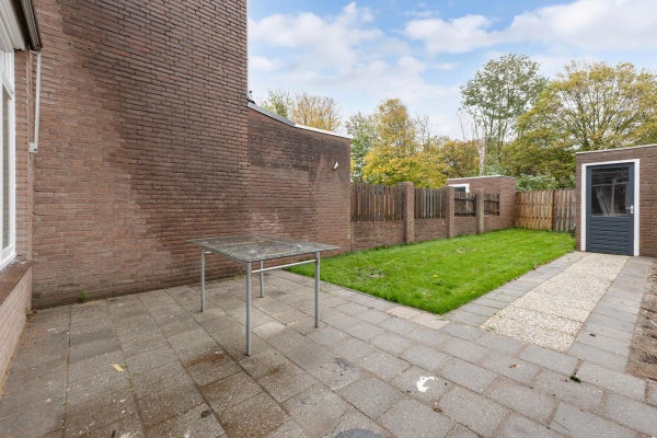 Bij binnenkomst stap je in een ruime hal met toilet. De lichte woon- en eetkamer is aangenaam ruim en beschikt over veel natuurlijke lichtinval. Vanuit de keuken loop je direct de achtertuin in, die deels is voorzien van gras en bestrating, inclusief een achterom en vrijstaande berging.