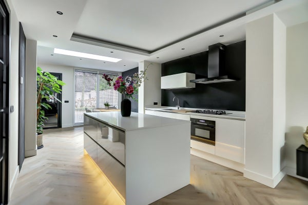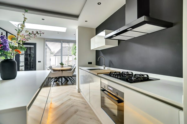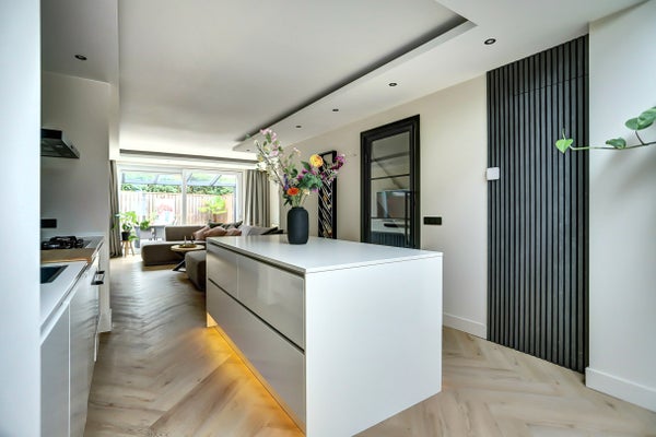 De keuken is voorzien van een eiland met royaal werkblad en diverse inbouwapparatuur. Aansluitend bevindt zich de lichte zithoek met grote schuifpui naar de tuin.