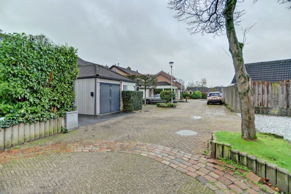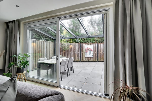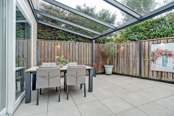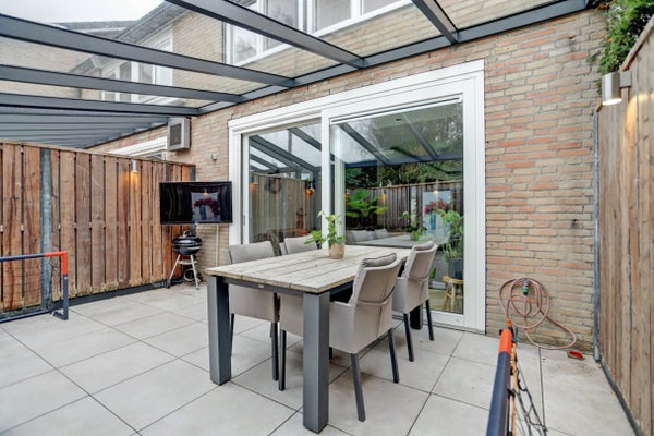 De achtertuin is onderhoudsvriendelijk aangelegd en voorzien van grote tegels en een moderne antracieten aluminium overkapping, waardoor je hier vrijwel het hele jaar door comfortabel buiten kunt zitten.