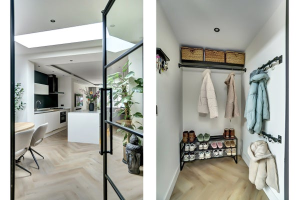 Mooie hal met garderobenis en toegang tot de inpandige berging.