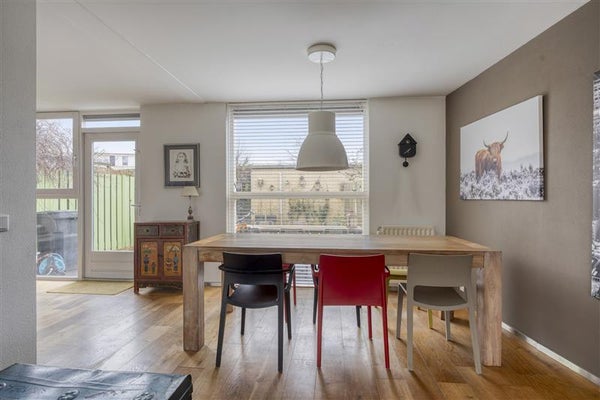 Aan de linkerzijde bevindt zich de keuken, een ware eye-catcher dankzij de frisse, moderne kleurstelling en strakke afwerking. Met alle benodigde inbouwapparatuur binnen handbereik bereid je hier de heerlijkste maaltijden. De speelse indeling zorgt ervoor dat keuken, eet- en woongedeelte prachtig in elkaar overlopen, waardoor dit de perfecte ruimte is voor lange avonden met vrienden of een gezellig ontbijt met het gezin.
