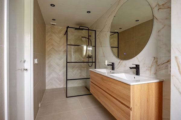 Op de eerste verdieping bevinden zich drie goed ingedeelde slaapkamers, elk met een rustige uitstraling en voldoende ruimte voor kasten of een bureau. De badkamer is stijlvol uitgevoerd met een douche, wastafel met spiegel en toilet.