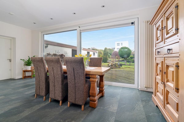 De woonkamer is ingericht met een zit en eetgedeelte en biedt via een schuifpui direct toegang tot de achtertuin, wat zorgt voor een fijne interactie tussen binnen en buiten – ideaal tijdens zonnige dagen of gezellige avonden met familie en vrienden. De woonkamer en de bijbouw is voorzien en een antraciet doorlopende pvc vloer. De keuken en de gang is voorzien van een grijze plavuizen vloer.