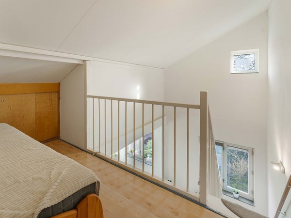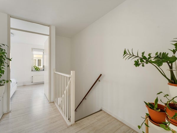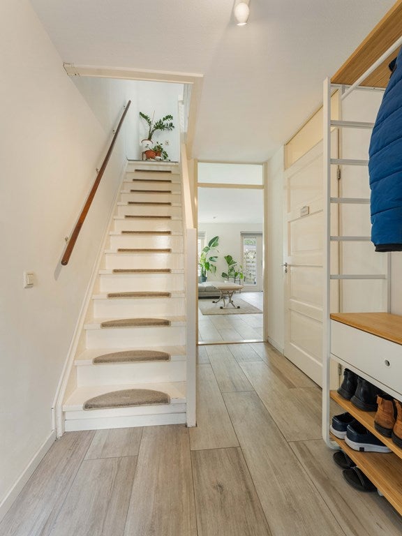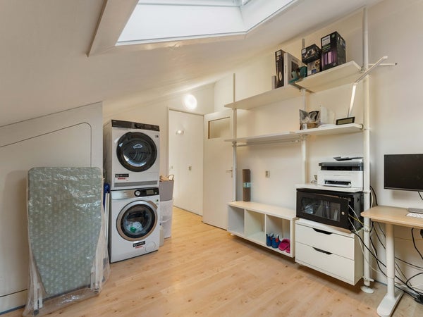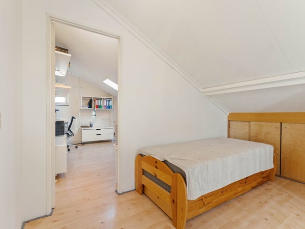 Vanuit de slaapkamer aan de achterzijde leidt een vaste trap naar de bovenste verdieping. Hier bevinden zich nog twee slaapkamers. De kamer aan de voorzijde is licht en veelzijdig in te richten, bijvoorbeeld als extra slaapkamer, werkruimte of hobbykamer. De slaapkamer aan de achterzijde beschikt over de aansluiting voor de wasmachine en biedt daarnaast praktische bergruimte.