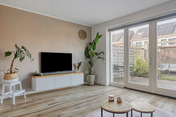Loop door en laat je verrassen door de lichte, tuingerichte woonkamer. Dankzij de openslaande deuren wordt binnen buiten, terwijl de vloerverwarming onder de smaakvolle pvc-vloer ervoor zorgt dat je hier het hele jaar door behaaglijk woont.