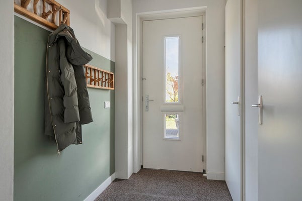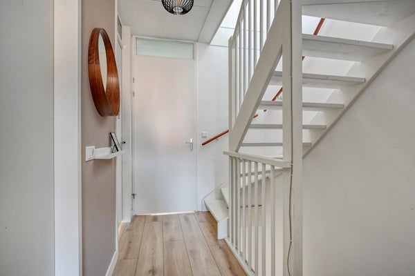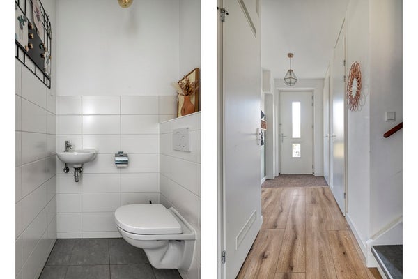Je stapt de woning binnen via een uitnodigende voortuin. In de hal valt direct de verzorgde afwerking op; denk aan strakke lijnen, een moderne garderobekast voor alle jassen en tassen, en een keurige meterkast. Onderweg naar het woongedeelte kom je eerst langs een fris afgewerkte toiletruimte met hangend toilet en fonteintje.
