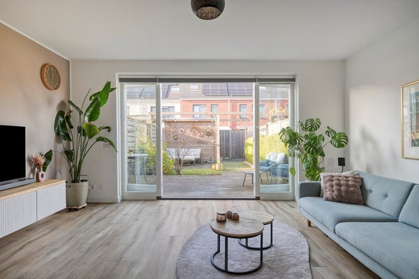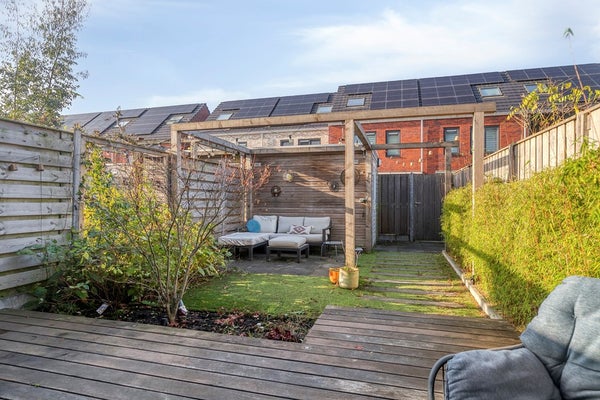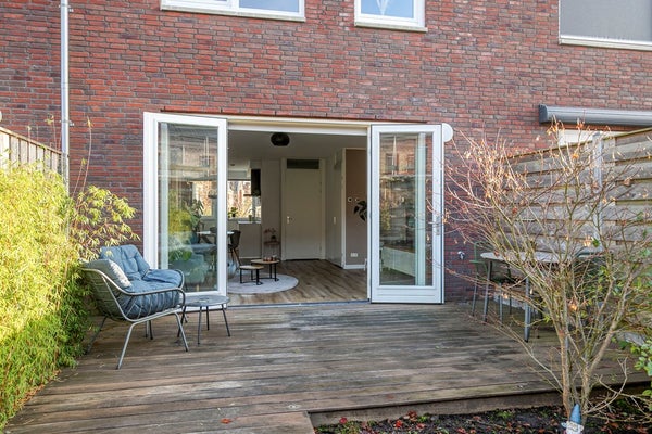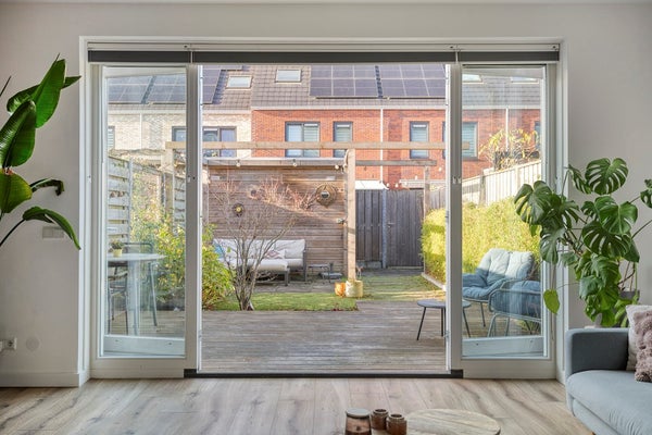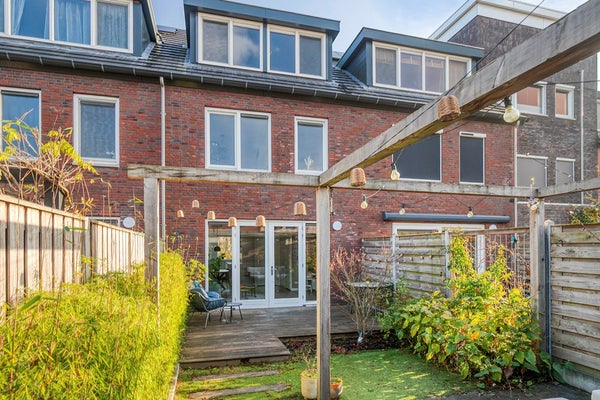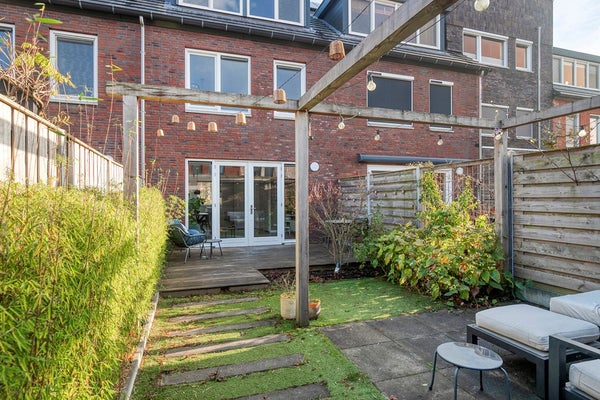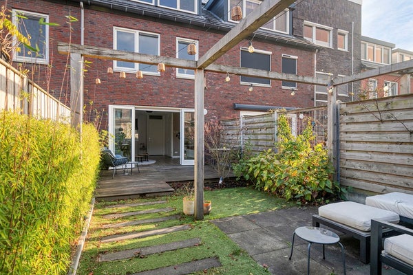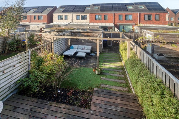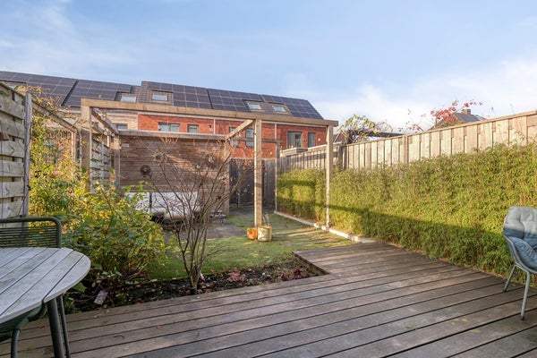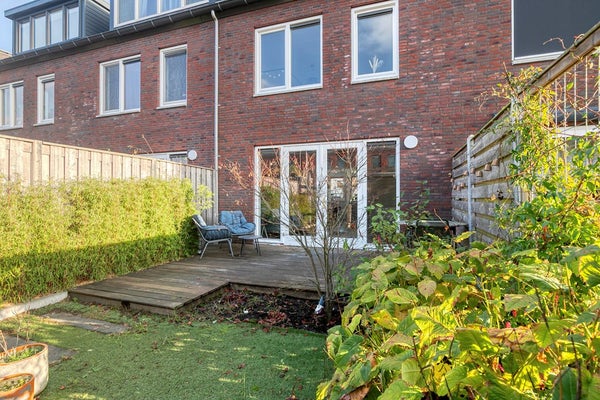 Via de openslaande deuren loop je zo de royale achtertuin (74 m2!) in, gelegen op het westen, ideaal voor die zonnige borrel in de namiddag. De tuin vraagt nauwelijks onderhoud, biedt ruimte voor kinderen om te ravotten en beschikt bovendien over een vrijstaande houten berging en een handige achterom.