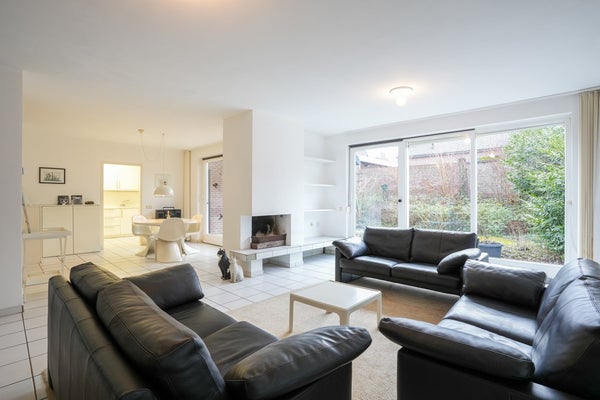 De ruime en lichte woon-/eetkamer heeft een totale oppervlakte van circa 42 m² en biedt dankzij twee schuifpuien een prettige verbinding met de tuin. De open haard zorgt voor extra sfeer en comfort.