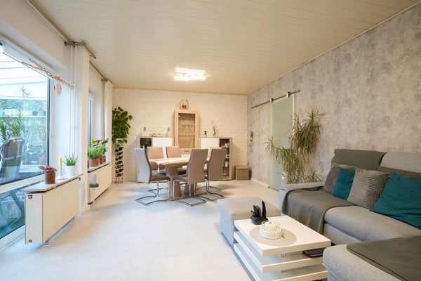 Lichte woonkamer (26,4 m²) met serre (17,8 m²) voorzien van elektra.