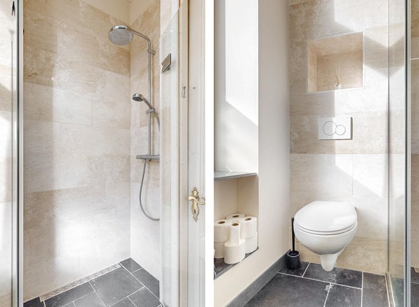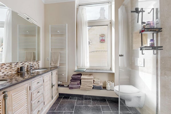 De vernieuwde badkamer is volledig betegeld en uitgerust met een stijlvol badmeubel met dubbele wastafel en kastruimte, een ruime inloopdouche, designradiator en wandcloset.