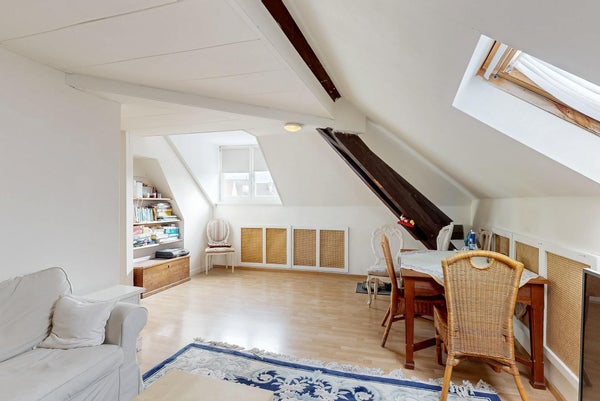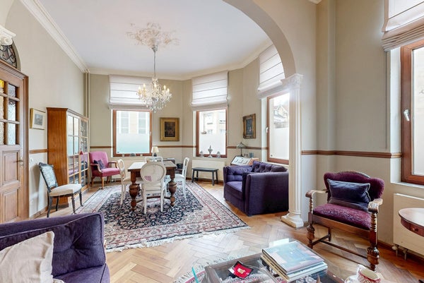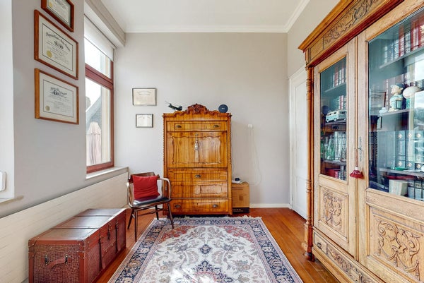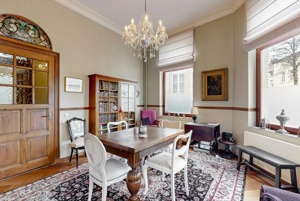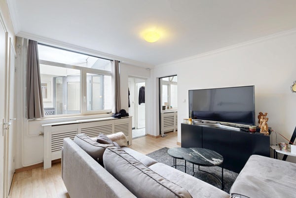 De ruime woonkamer (ca. 33 m²) is uitsluitend bereikbaar via de entree/hal en geniet van veel daglicht dankzij de grote raampartijen. De nieuwe eikenhouten vloer, in combinatie met authentieke elementen zoals de schouwpartij, sierlijsten en plafondornamenten, zorgt voor een warme en elegante uitstraling.