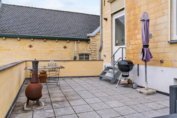 Het dakterras van ca. 33 m², gelegen op het zuidoosten, is een absoluut hoogtepunt. Hier geniet u van rust, privacy en een prachtig uitzicht op de ruïne en de kerk. Het terras is voorzien van elektra, buitenkraan en hoogwaardige plavuizen