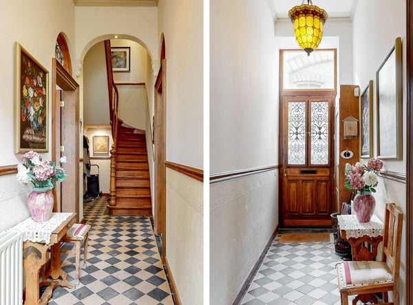 De statige entree/hal maakt direct indruk door de authentieke vloertegels, originele deurkozijnen, sierlijke ornamenten en imposante trappartij. Vanuit deze hal is toegang tot zowel de woonkamer als de royale leefkeuken van ca. 19 m², volledig vernieuwd in 2025.