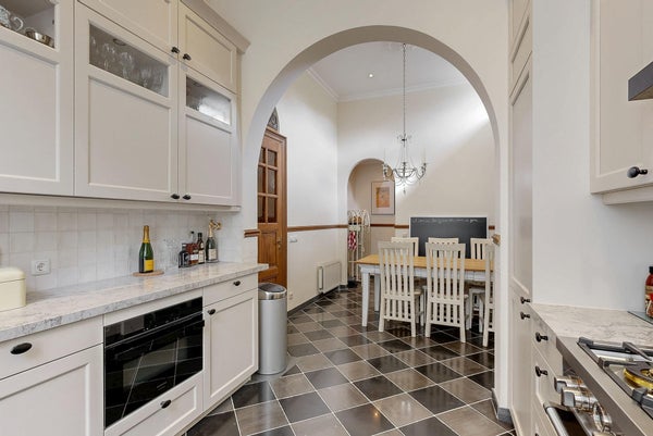 De leefkeuken is uitgevoerd in een luxe U-opstelling en voorzien van hoogwaardige inbouwapparatuur, waaronder een 6-pits gaskookplaat met dubbele oven, afzuigschouw, koelkast, vriezer, vaatwasser en magnetron. De blauwstenen vloer met vloerverwarming benadrukt het hoogwaardige en statige karakter van deze ruimte.