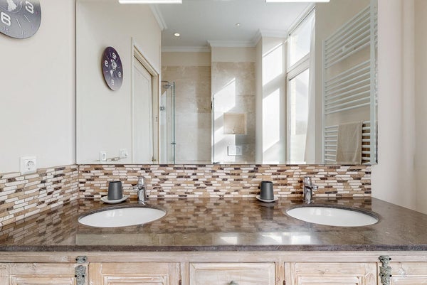 Doucheruimte met wastafelmeubel, designradiator en inloopdouche