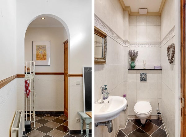 Direct grenzend aan de keuken bevindt zich een volledig betegelde toiletruimte, voorzien van een wandcloset, fonteintje én vloerverwarming — een comfortabel en luxe detail.