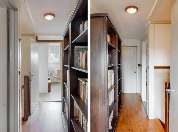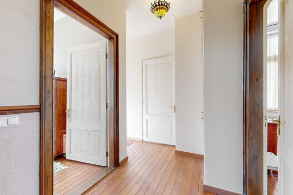 De royale overloop met nieuwe houten vloer biedt toegang tot drie ruime slaapkamers, een muurkast, cv-kast, wasruimte, de badkamer en het dakterras. De slaapkamers hebben een oppervlakte van circa 13 m², 13 m² en 16 m².