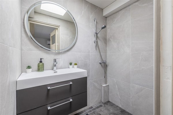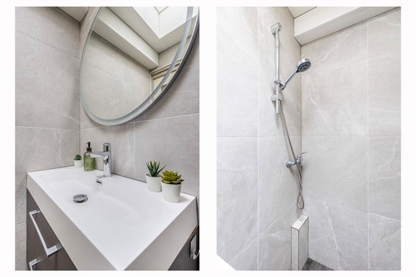 Badkamer, 2 m², v.v. betegeling, douche, wastafelmeubel en een dakkoepel.
