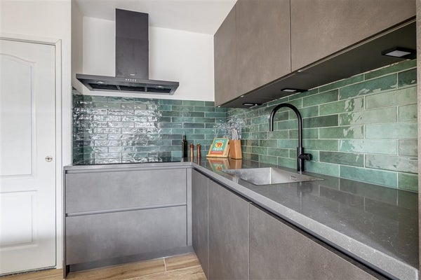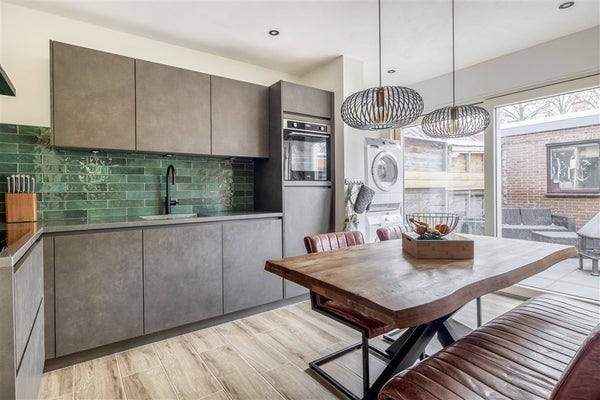 Uitgebouwde keuken, 14 m², v.v. plavuizen, met een inbouwkeuken v.v. inductiekookplaat, afzuigkap, oven, vaatwasser, koelkast, airco, aansluiting wasautomaat en droger en schuifpui naar achtertuin.