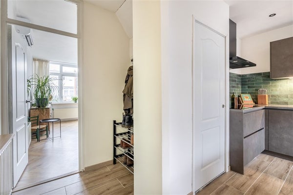 Via de entree met meterkast kom je in de woning. Hier bevinden zich ook het toilet en de toegang tot de lichte woonkamer, die is voorzien van een moderne visgraat laminaatvloer, airconditioning en een zonnescherm. Aansluitend bevindt zich de uitgebouwde keuken, voorzien van plavuizen en een moderne inbouwkeuken met inductiekookplaat, oven, vaatwasser, koelkast en een schuifpui naar de achtertuin. Tevens zijn hier de aansluitingen voor wasmachine en droger aanwezig.